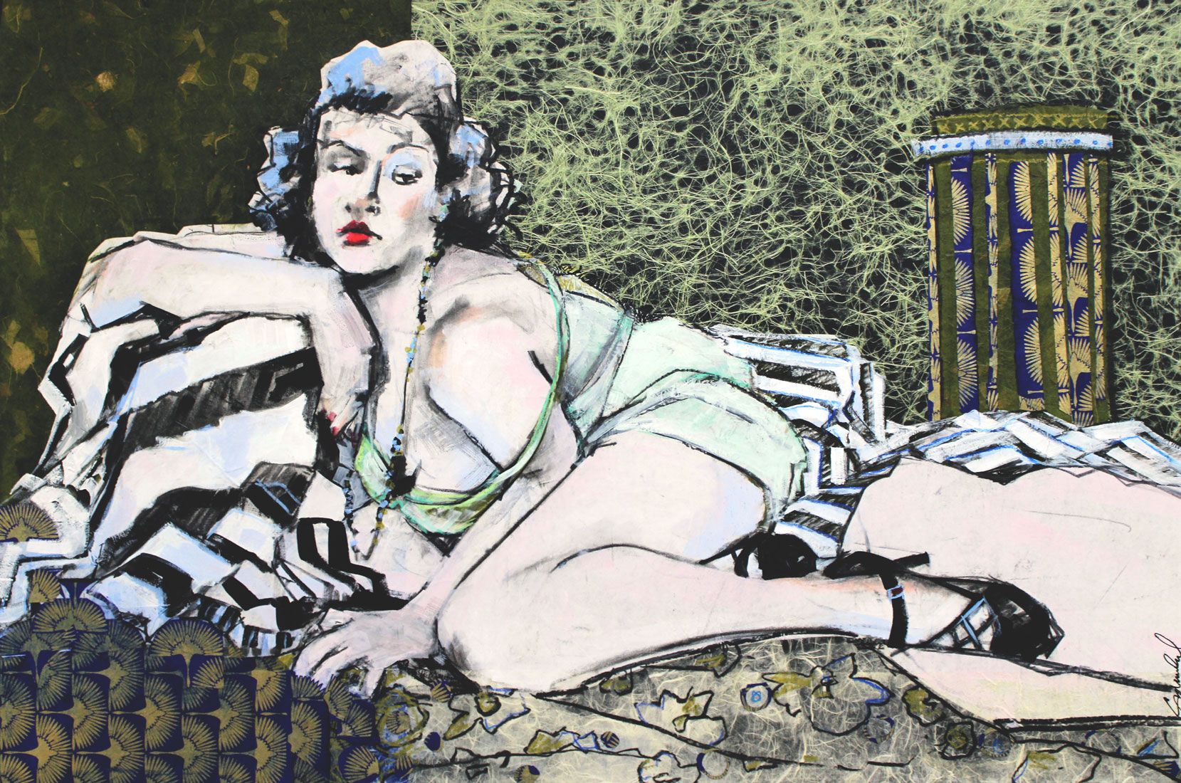 Layers of torn papers, drawings, and poems create visual interest and intrigue before the paint ever touches the boards. I make these vibrant pieces in the hope that they empower other women to see their own sense of beauty.” Focusing on painting unapologetic women, I believe all women should be able to feel their own sense of beauty, and not have to compromise to feel seen. I begin on a black substrate, as I like the way color works on the dark surface. Then comes the collage. The substrate gets covered with papers - gestures from a life drawing session, hand drawn ink drawings on tissue paper, scraps of poems or lyrics, cut outs of lovely handmade papers. The muse is drawn, usually with charcoal and conte, then sealed onto the collage. The painting is completed with oil and cold wax. Depth is created with this process - mixing a hard emotion with a good line and a soft background. Drawing is important, line is celebrated rather than covered entirely with paint.”