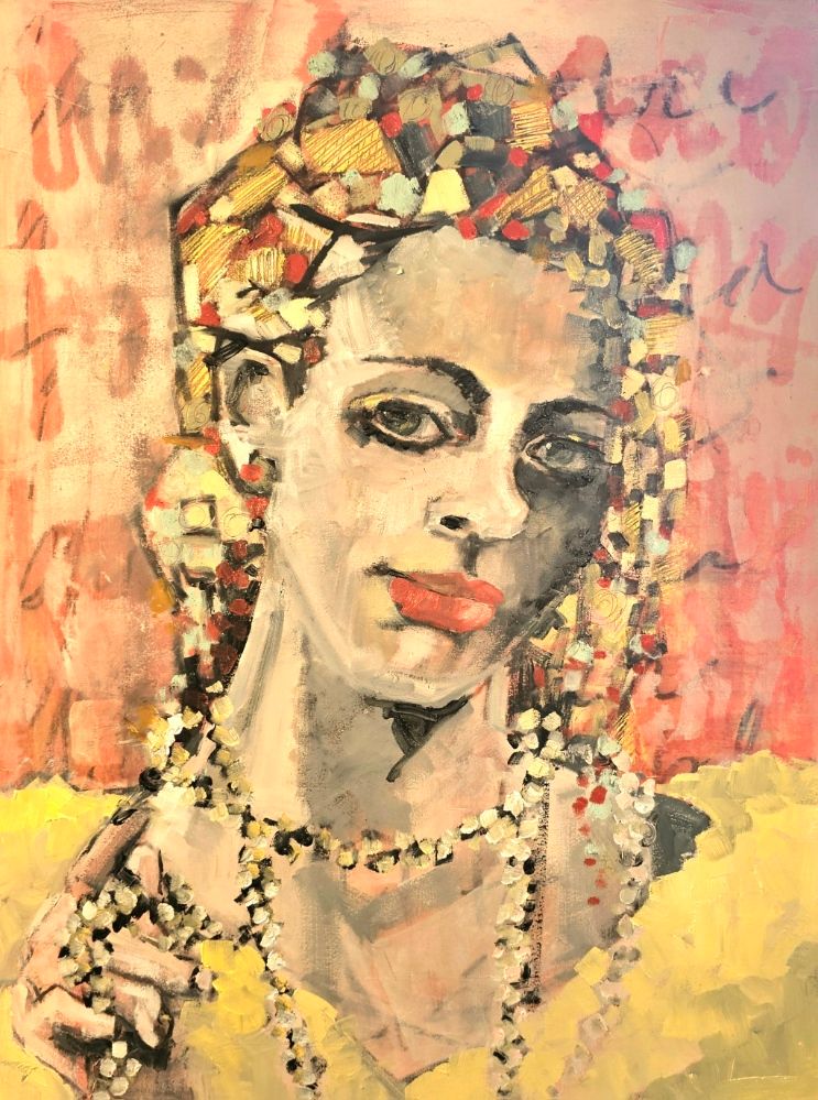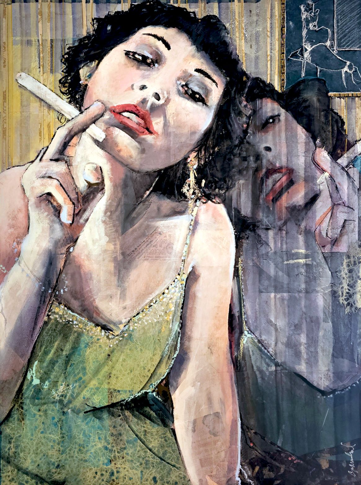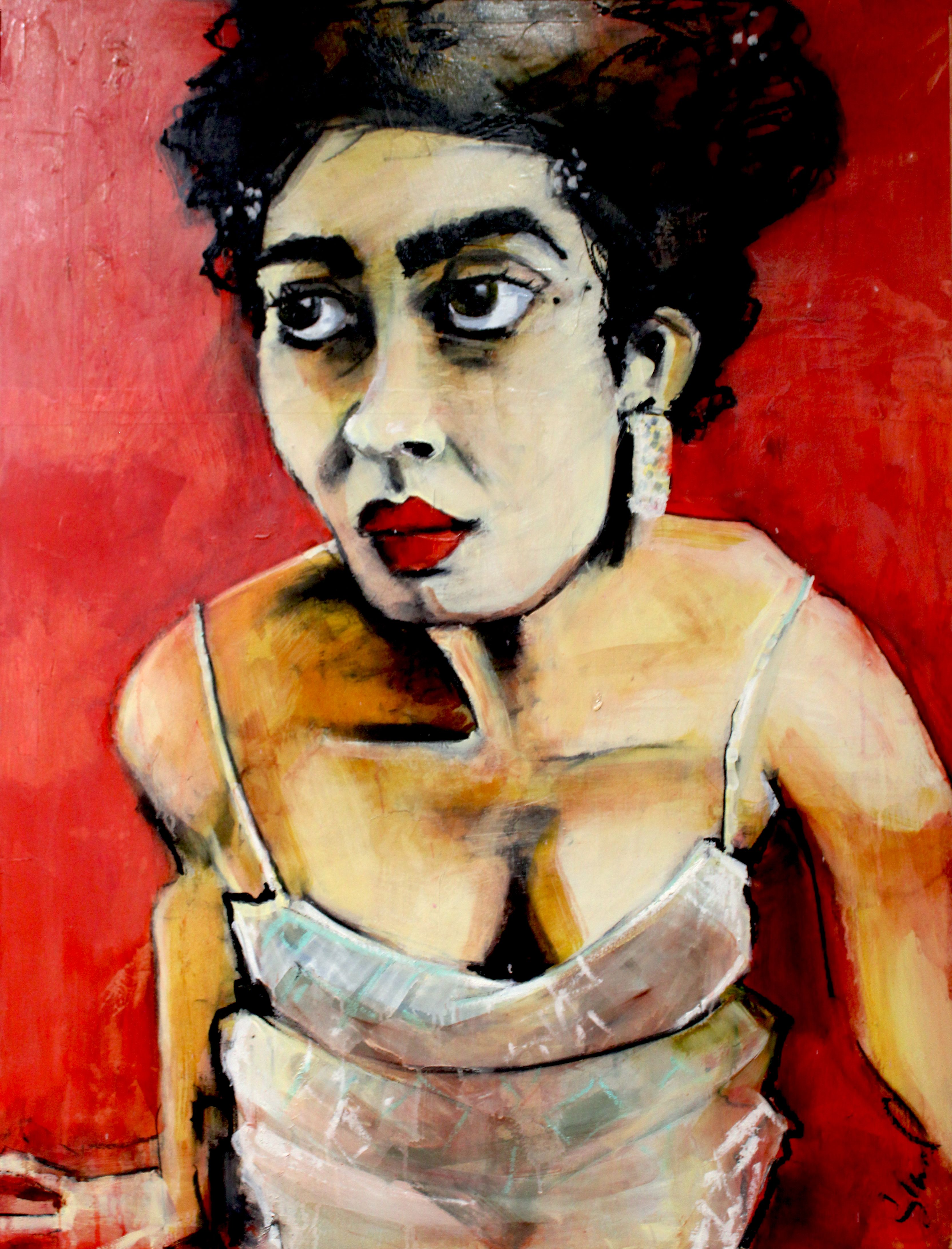Layers of torn papers, drawings, and poems create visual interest and intrigue before the paint ever touches the boards. I make these vibrant pieces in the hope that they empower other women to see their own sense of beauty.” Focusing on painting unapologetic women, I believe all women should be able to feel their own sense of beauty, and not have to compromise to feel seen. I begin on a black substrate, as I like the way color works on the dark surface. Then comes the collage. The substrate gets covered with papers - gestures from a life drawing session, hand drawn ink drawings on tissue paper, scraps of poems or lyrics, cut outs of lovely handmade papers. The muse is drawn, usually with charcoal and conte, then sealed onto the collage. The painting is completed with oil and cold wax. Depth is created with this process - mixing a hard emotion with a good line and a soft background. Drawing is important, line is celebrated rather than covered entirely with paint.”