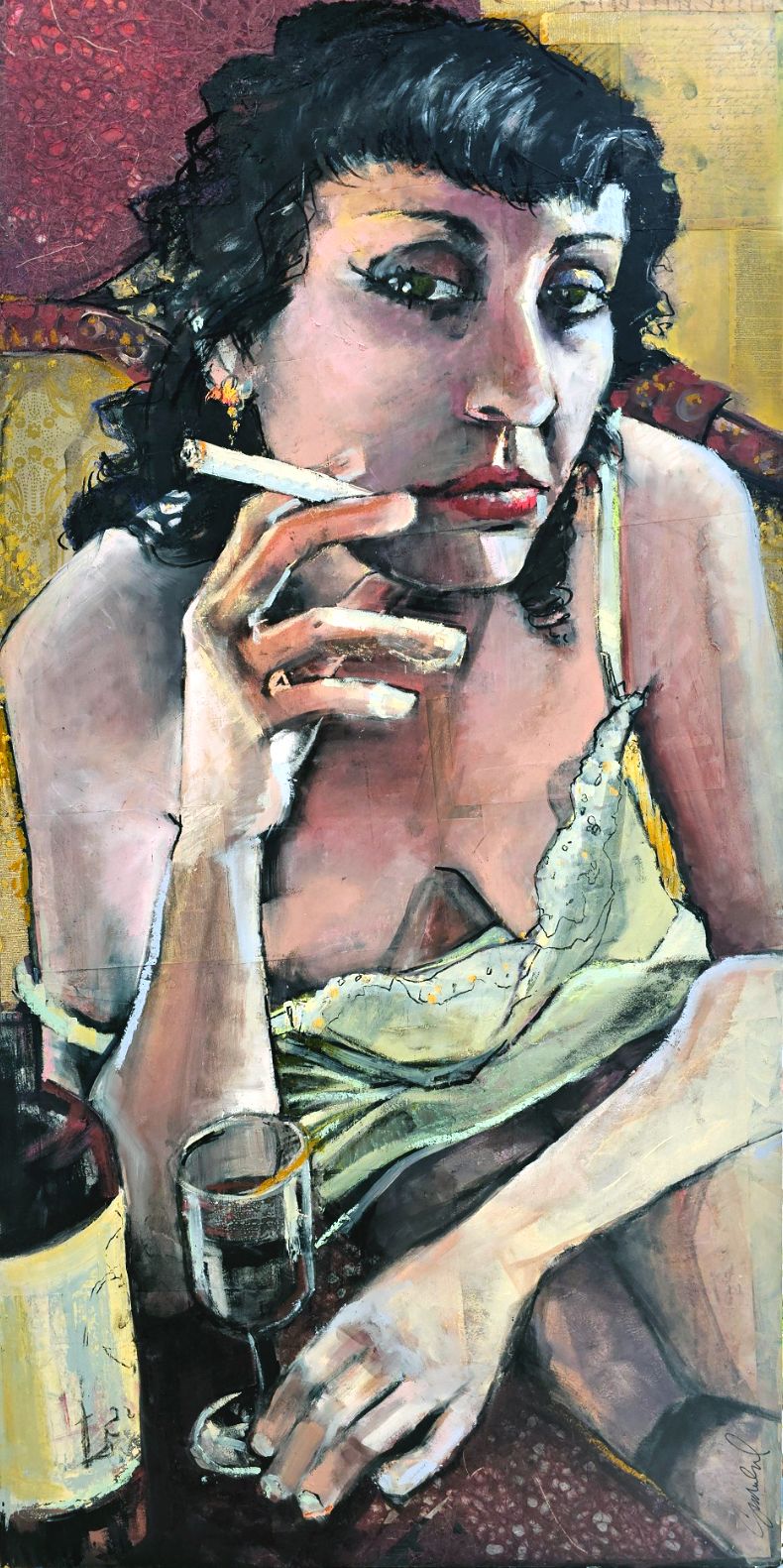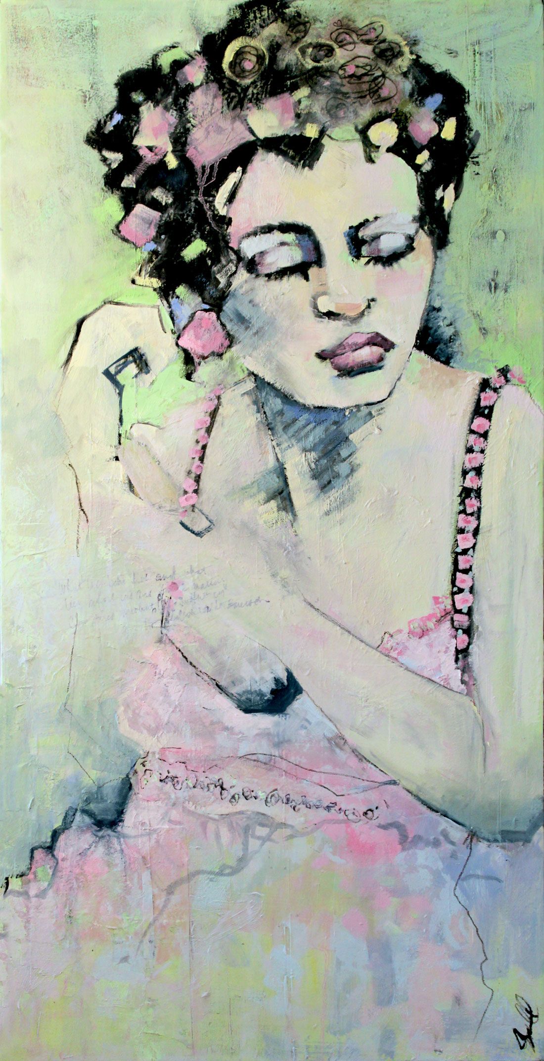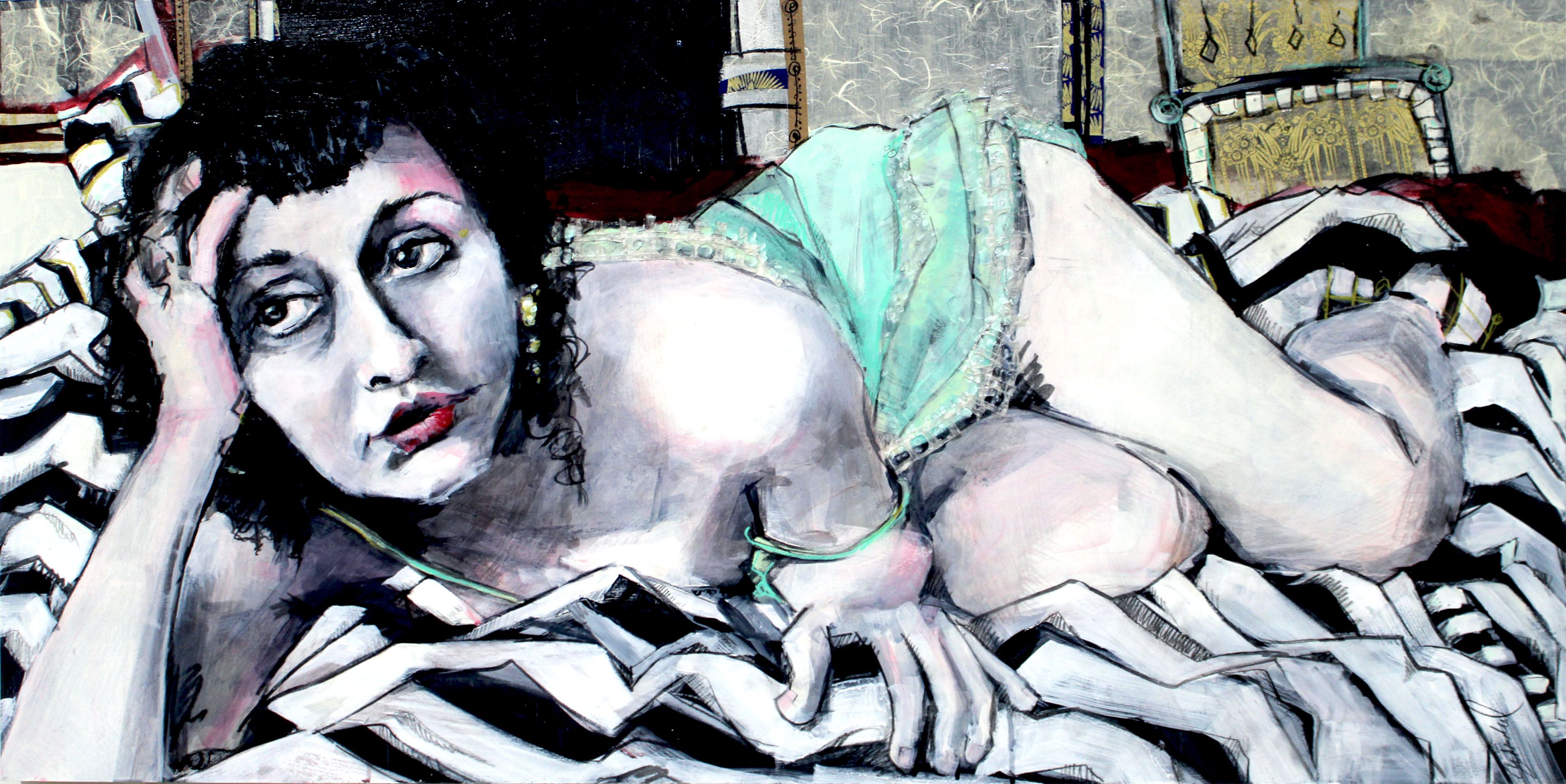 Layers of torn papers, drawings, and poems create visual interest and intrigue before the paint ever touches the boards. I make these vibrant pieces in the hope that they empower other women to see their own sense of beauty.” Focusing on painting unapologetic women, I believe all women should be able to feel their own sense of beauty, and not have to compromise to feel seen. I begin on a black substrate, as I like the way color works on the dark surface. Then comes the collage. The substrate gets covered with papers - gestures from a life drawing session, hand drawn ink drawings on tissue paper, scraps of poems or lyrics, cut outs of lovely handmade papers. The muse is drawn, usually with charcoal and conte, then sealed onto the collage. The painting is completed with oil and cold wax. Depth is created with this process - mixing a hard emotion with a good line and a soft background. Drawing is important, line is celebrated rather than covered entirely with paint.”